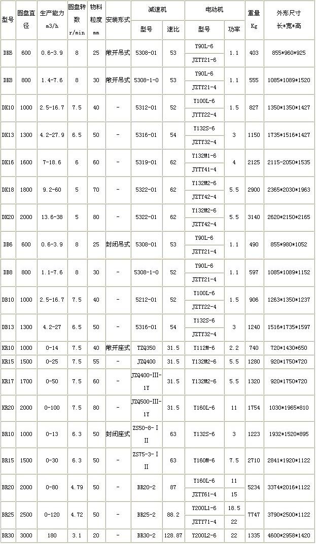 圓盤給料機是一種使用廣泛的連續式容積加料設備,能均勻連續地將物料喂送到下一設備中,喂料量可以調節,可喂送粉狀、小塊狀的物料(如煤粉、粘土等),是一般磨機、烘干機的常用配套設備。其中,DK型為吊開式圓盤給料機,DB型為吊閉式圓盤給料機,KR型為座式圓盤給料機。