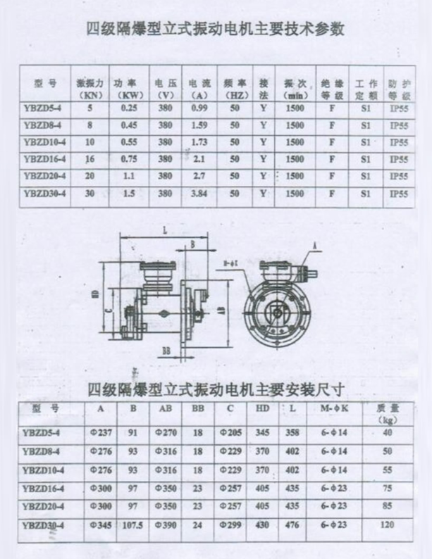 YBZD系列戶外隔爆型振動三相異步電動機(簡稱防爆型振動電機),其工作原理和通用型振動電機類似,是利用兩端的偏心塊高速旋轉(zhuǎn)產(chǎn)生振動力作為振動源。該系列防爆振動電機具有設(shè)計合理、結(jié)構(gòu)緊湊、激振效率高、節(jié)能、壽命長、運行可靠、安裝調(diào)試方便等優(yōu)點。可作為振動料斗、振動篩、圓振篩、振動給料機、振動輸送機的要求防爆環(huán)境工作振動源。其防爆性能符合GB3836.2-2000《爆炸性氣體環(huán)境用電氣設(shè)備——隔爆型”d"》。防爆標志為ExdⅡBT4,使用于Ⅱ類A、B級T1~T4組可燃性氣體或蒸汽與空氣形成的爆炸性混合物的場所。