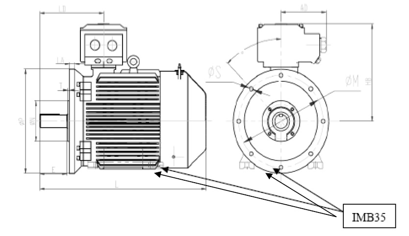 機座號 80-355 主接線盒位于電機頂部(從電機軸伸端看),出線口可四個方向調整,但 160中心高及以上接線盒出線口朝后(朝非軸伸端)時,由于吊環的影響,需在安裝現場,將電機吊裝到位后,取下吊環,打開接線盒蓋,松開接線盒與機座聯接螺栓,將接線盒出線口朝后調裝。